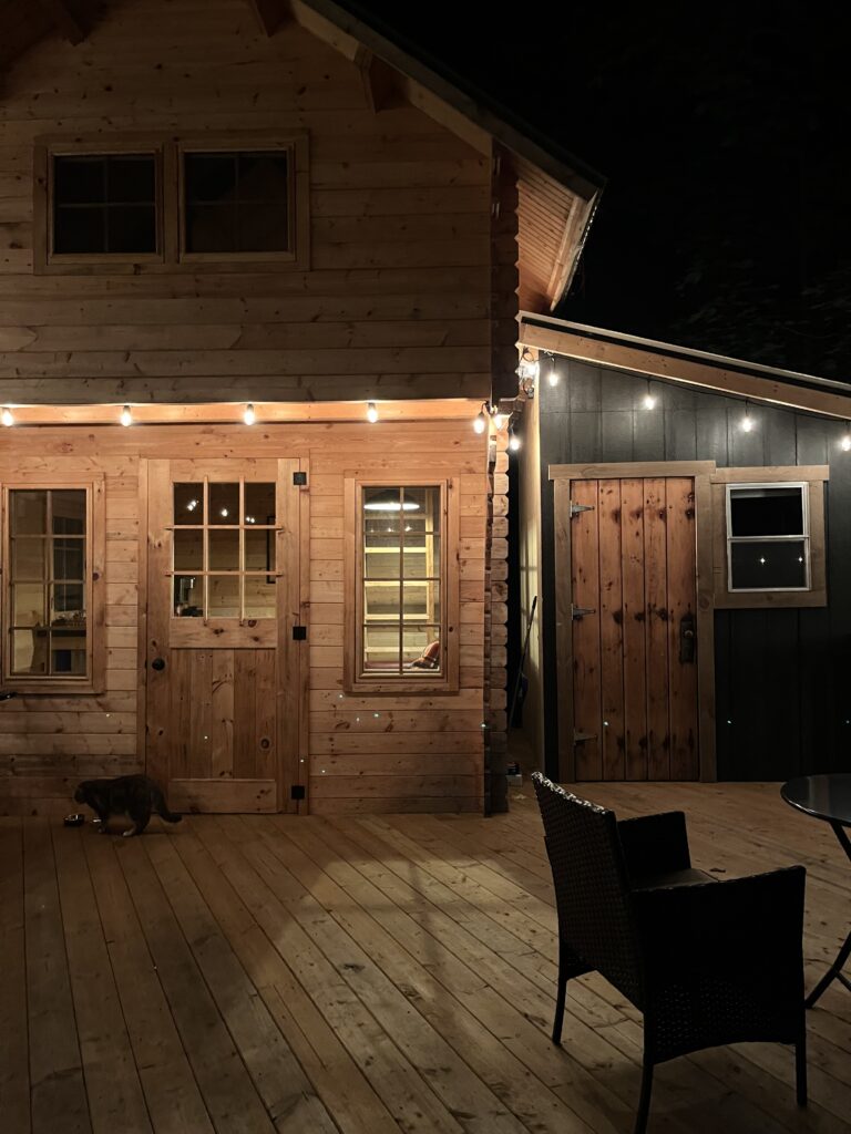 Inside the bunkie, you’ll find a queen loft bed, a loveseat facing the electric fireplace, and a well-equipped kitchenette for easy, unrushed meals or lazy morning coffee.